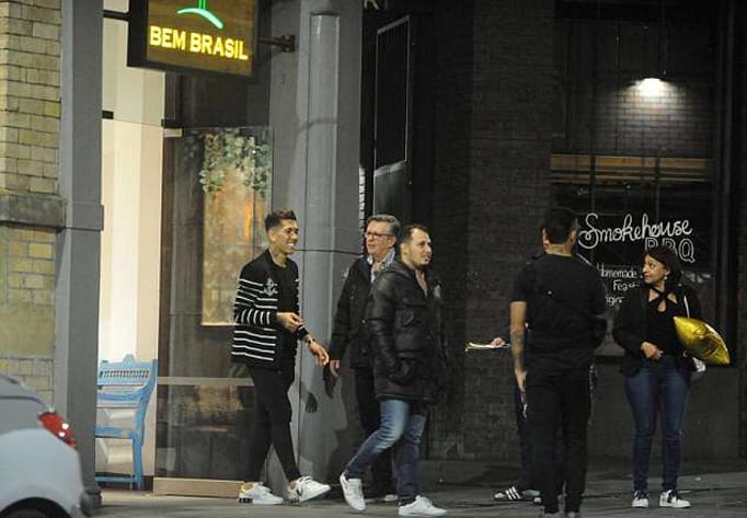 Firmino (trái) cùng mẹ Mariana (phải) và người thân rời nhà hàng khi trời gần sáng. Hình ảnh: DS