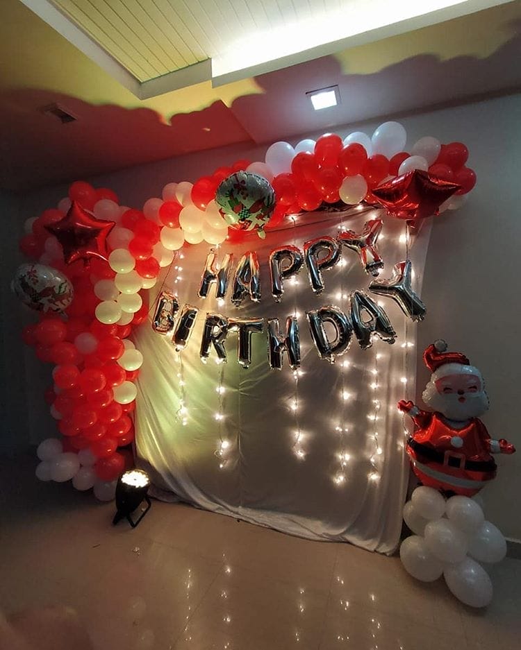 Bộ phụ kiện trang trí bao gồm: Backdrop sinh nhật cùng bộ dây bong bóng chủ đề giáng sinh