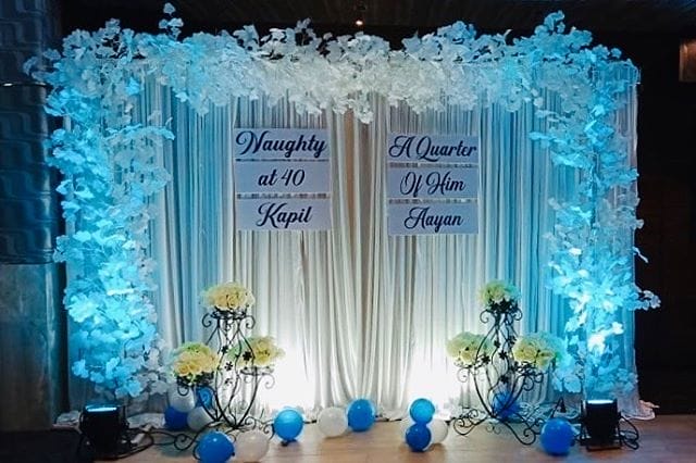 Sản phẩm trang trí bao gồm: Backdrop sinh nhật, viền hoa trắng,…