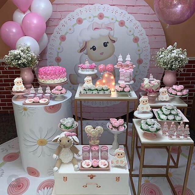 Chi tiết về bộ sản phẩm trang trí bàn quà sinh nhật bé gái cừu con XV358