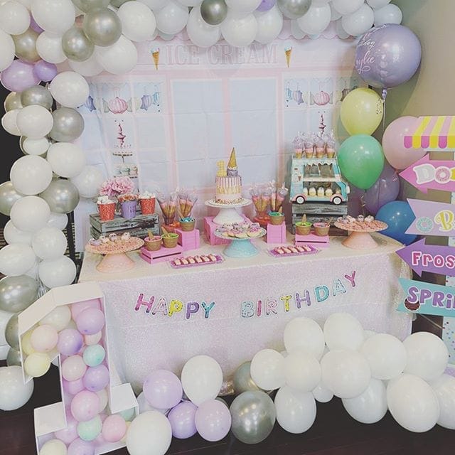 Sản phẩm trang trí bao gồm: Backdrop sinh nhật, dây bong bóng, bàn quà và các phụ kiện đi cùng
