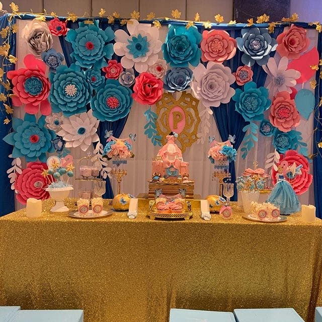 Sản phẩm bao gồm: Trang trí bàn sinh nhật vàng đồng, cùng bộ backdrop đầy màu sắc bằng vải voan và hoa giấy.
