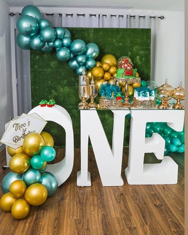 Sản phẩm trang trí bao gồm: Backdrop cỏ nhân tạo, dây bong bóng, bàn trang trí cùng những phụ kiện đi kèm