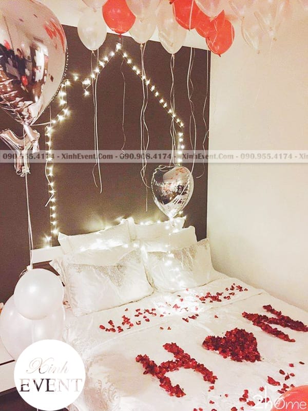 Bóng bay sinh nhật kết hợp bóng bạc và hoa trang trí phòng ngủ XV144 với phong cách thiết kế lãng mạn đem lại một buổi tối ấm ấp cho các cập đôi, các cập vợ chồng,…