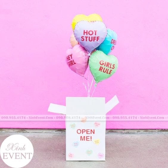 Sản phẩm bao gồm: Hộp quà bất ngờ, bóng bạc trái tim có in logo, quà tặng bên trong