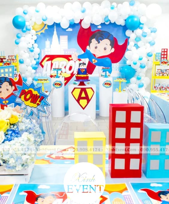 Sản phẩm bao gồm: Backdrop sinh nhật với hình ảnh Superman, khổi 3D, bong bóng trang trí xung quanh backdrop và sàn nhà, hoa tươi, trọn bộ phụ kiện sinh nhật Superman bao gồm ly, nón, bánh kem, hộp quà,…