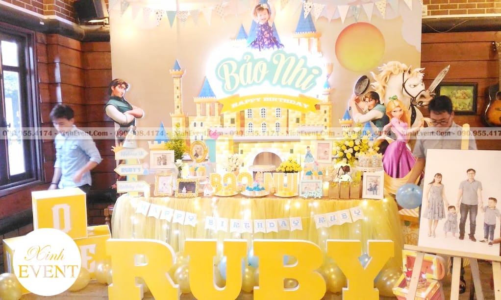 Trang trí bàn sinh nhật theo chủ đề XV021 được sử dụng chủ đề sinh nhật công chúa tóc dài Tangled làm trang trí. Bàn sử dụng màu vàng làm chủ đạo nên rất sang trọng và quý phái. Trong sản phẩm trên bao gồm: Phụ kiện sinh nhật, các khối tạo hình nghệ thuật, backdrop sinh nhật, khung hình,…