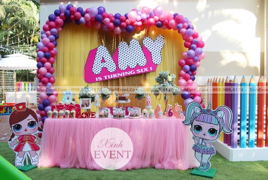 Bàn sự kiện sinh nhật Lol XV014 lấy cảm hứng từ chủ đề hoạt hình Lol surprise nên bàn quà có màu sắc chủ đạo là màu hồng nhẹ nhàng kết hợp với các màu sắc tươi tắn khác tạo nên điểm nhấn và nổi bật riêng của sản phẩm sinh nhật.