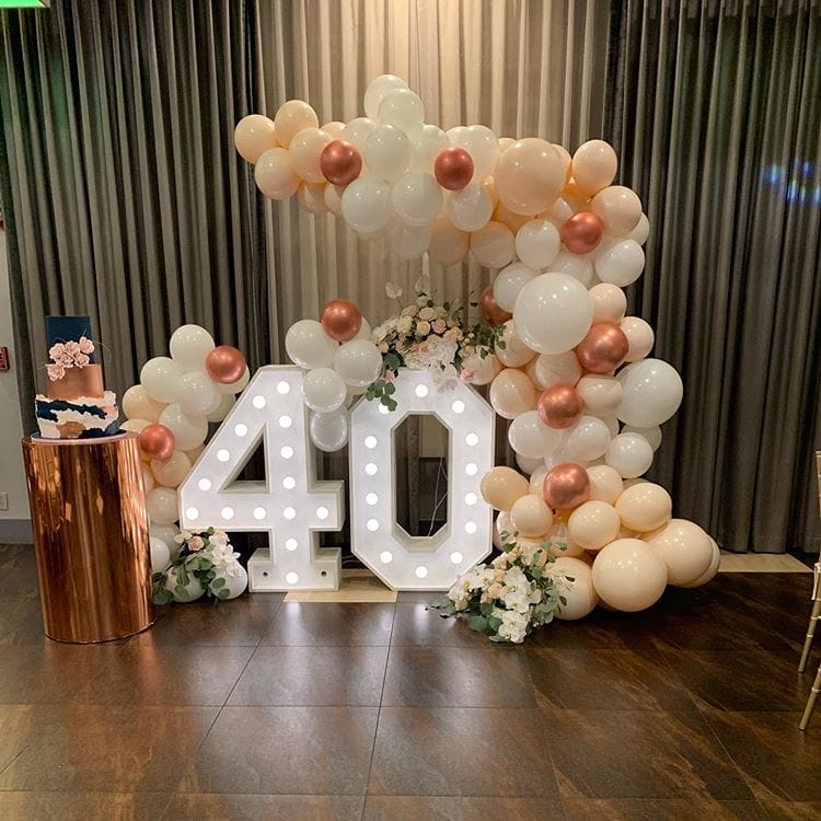 Sản phẩm bao gồm: Dây bong bóng, bộ tiểu cảnh chữ số 3D cùng bàn gallery,…