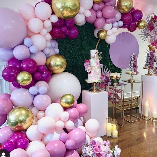 Sản phẩm trang trí bao gồm: Backdrop sinh nhật, dây bong bóng cùng bàn quà sinh nhật