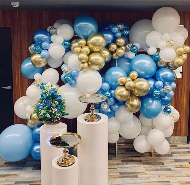 Sản phẩm bao gồm: backdrop bong bóng cùng bộ sản phẩm trang trí bàn sinh nhật